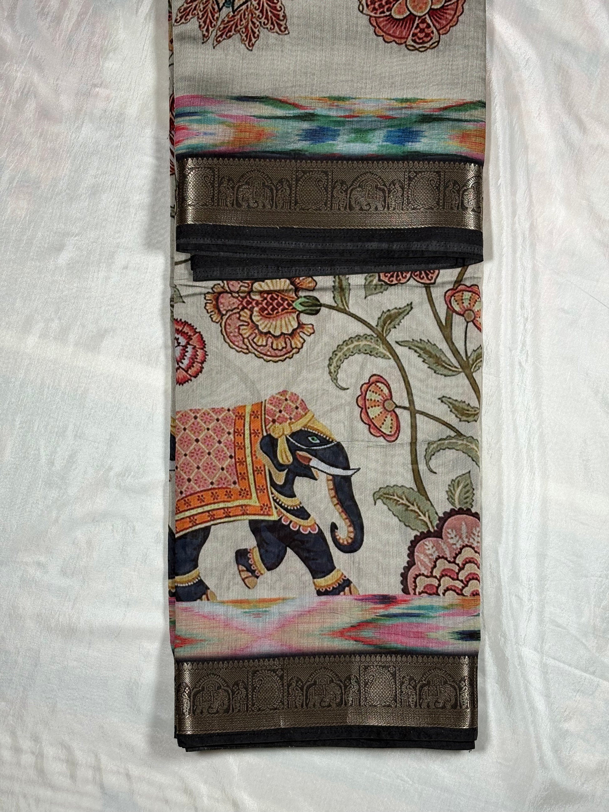 Elegant Black & Cream Cotton Silk Saree with Kalamkari Elephant Print & Zari Border
